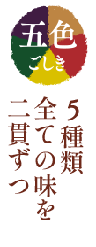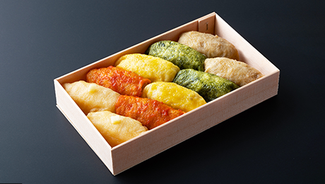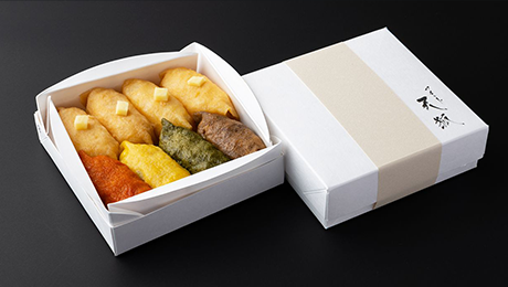 いなり寿司の魅力をを存分に楽しめるようプレーンである「狐」を四貫と、色彩豊かな味を一貫ずつ盛り込みました