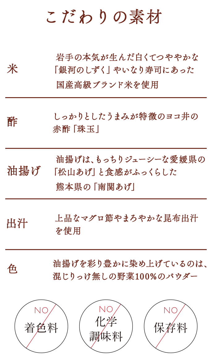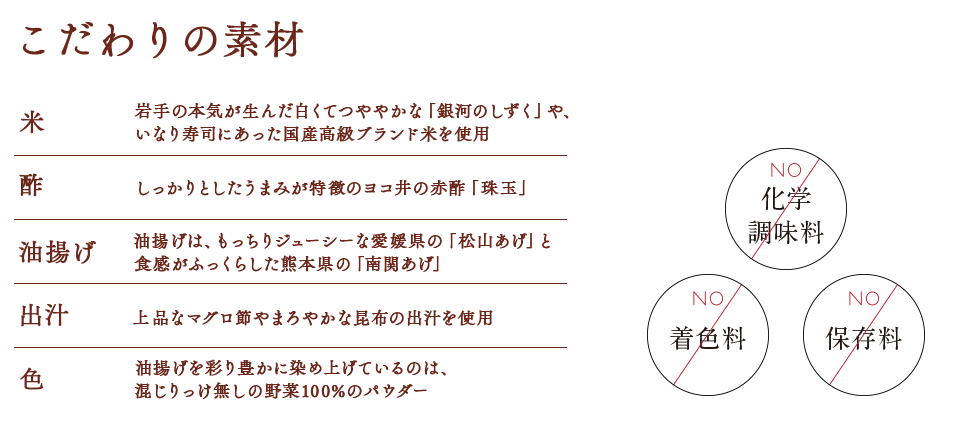 油揚げを引き立てる出汁と淡口醤油で関西風に煮しめ、赤酢を使った旨味とキレのあるシャリを包みました。ピリッとしまったガリが食感にアクセントを加えます