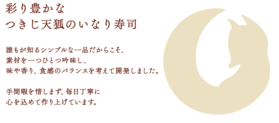 要予約いなり専門店「つきじ天狐」の看板商品五種類全てのいなり寿司を二貫ずつ盛り 込みました。大切な方へのお持たせやお土産、ご自分へのご褒美、大事な日の記念にどうぞ